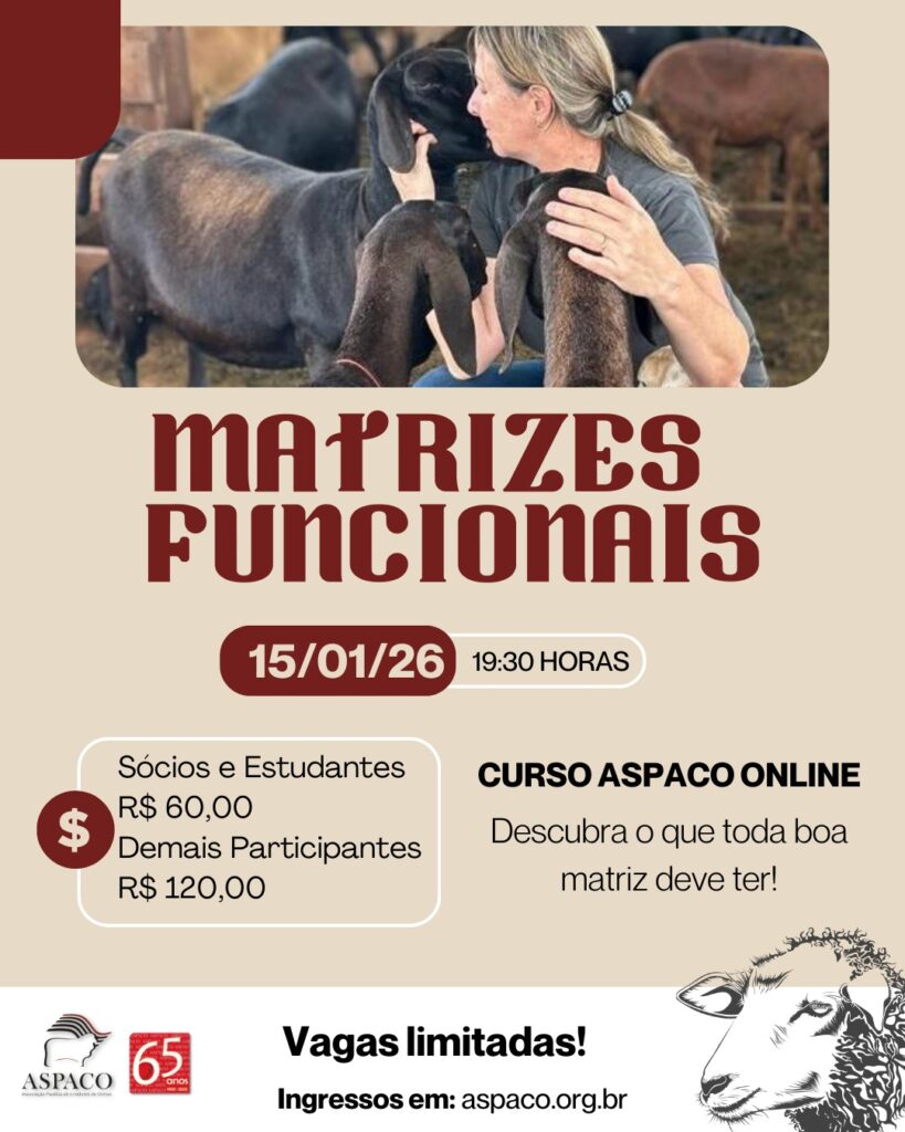 A ASPACO realiza, no dia 15 de janeiro de 2026, às 19h30, o curso online Matrizes Funcionais: Avaliação, Desempenho e Melhoramento, voltado a criadores, técnicos, estudantes e profissionais que buscam aprimorar a seleção e o manejo de fêmeas no rebanho.