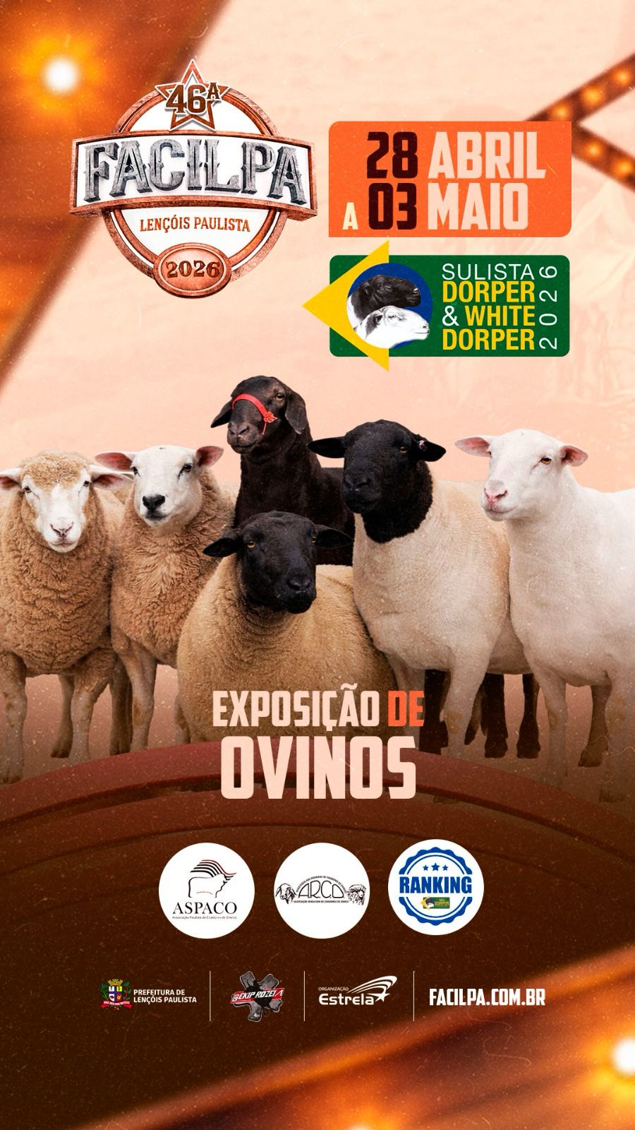 Exposição de Ovinos na 46ª Facilpa, em Lençóis Paulista, com julgamentos, participação no Ranking ASPACO e integração entre criadores, técnicos e público do setor.